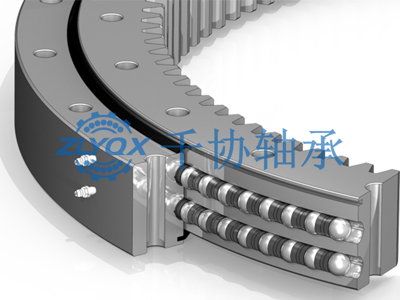 雙排球式回轉支承具有三個座圈,鋼球和隔離塊可直接排入上下滾道,根據(jù)受力狀況,安排了上下兩排直徑不同的鋼球。這種開式裝配非常方便,上下圓弧滾道的承載角都為75,能承受很大的軸向力和傾翻力矩。當徑向力大于0.1倍的軸向力時滾道須特殊設計。雙排球式回轉支承的軸向、徑向尺寸都比較大,結構緊固。特別適用于要求中等以上直徑的塔式起重機,汽車起重機等裝卸機械上。...